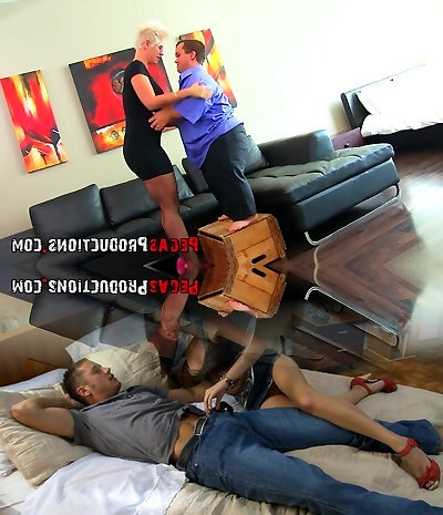 Tall and leggy blonde with gigantic boobs gets her pussy licked by a dwarf