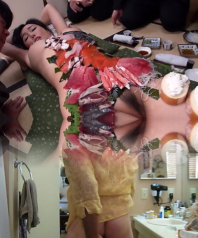 Kinky Japanese lady Haruka lets guys eat sushi off her body