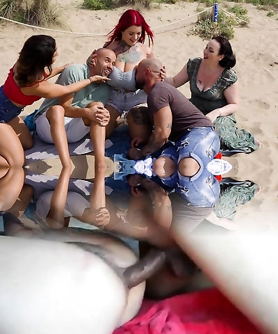 Chesty and mature mommas and horny daddies in group sex on the beach