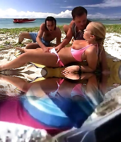 Babe is enjoying two dudes's attention on the beach
