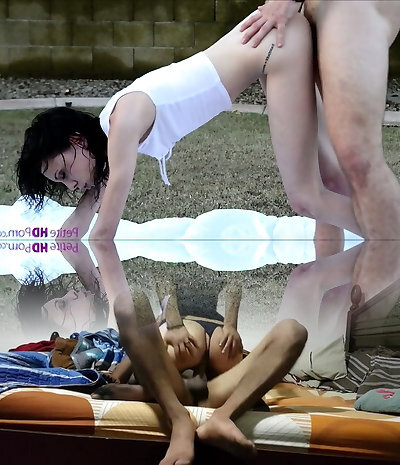 Lean brunette babe with small pretty tits enjoying a hard-core threesome